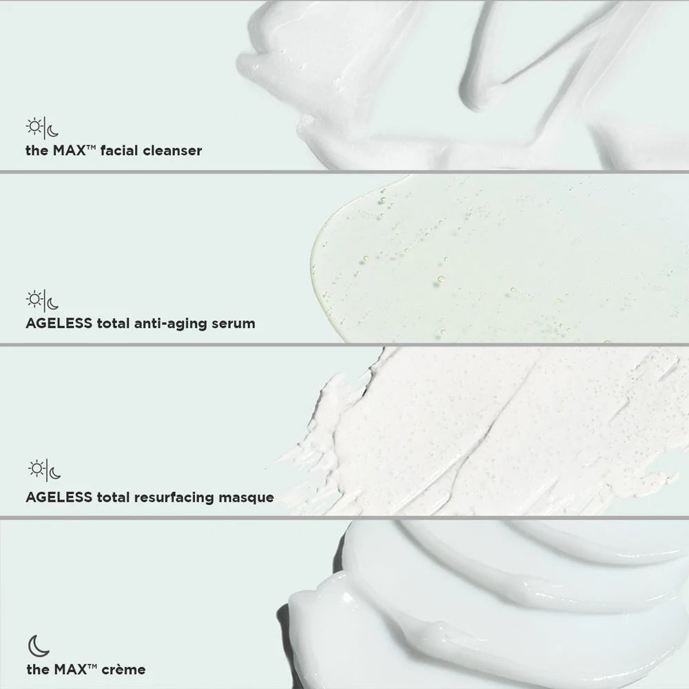 DESCRIPTION: This four-step trial kit includes favourites from the MAX™ and AGELESS collections. Combining corrective and replenishing benefits, these age-defying formulas feature glycolic acid, peptides and plant cell extracts for youthful-looking, radiant skin.