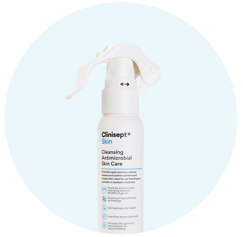 Clinisept+ Skin gently cleanses and refreshes the skin, making it ideal for use as part of a post-treatment skincare routine. It utilises advanced hypochlorous technology to support high levels of skin cleanliness and is well tolerated, even by sensitive skin. Clinisept+ has a skin-neutral pH and has been dermatologically tested to ensure it is gentle and suitable for all skin types.